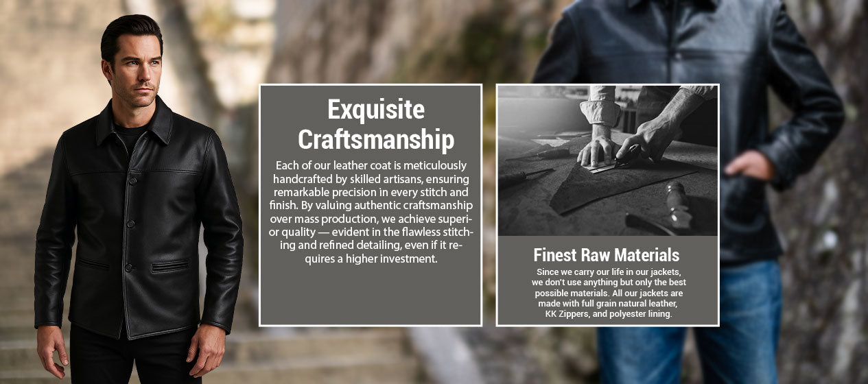 We begin with the best natural full-grain and top-grain hides that offer durability, strength, and comfort. Unlike imitation or split leather, ours grows richer with age, giving every jacket a character as unique as the person wearing it.