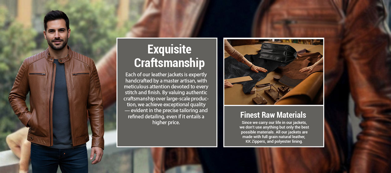 We begin with the best natural full-grain and top-grain hides that offer durability, strength, and comfort. Unlike imitation or split leather, ours grows richer with age, giving every jacket a character as unique as the person wearing it.