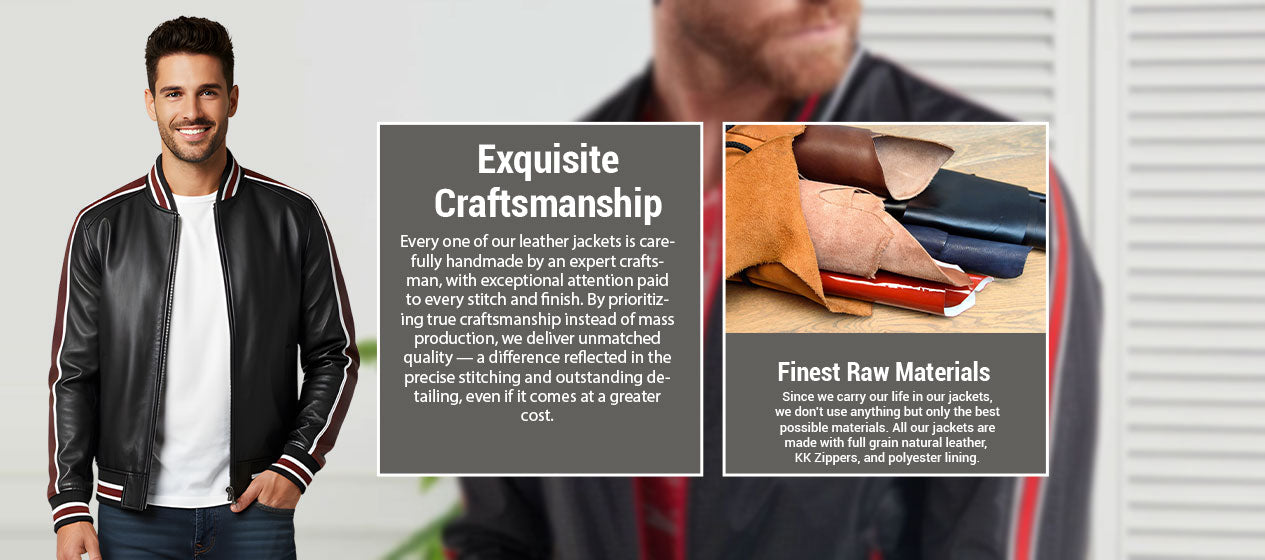 We begin with the bestnatural full-grain and top-grain hidesthat offer durability, strength, and comfort. Unlike imitation or split leather, ours grows richer with age, giving every jacket a character as unique as the person wearing it.