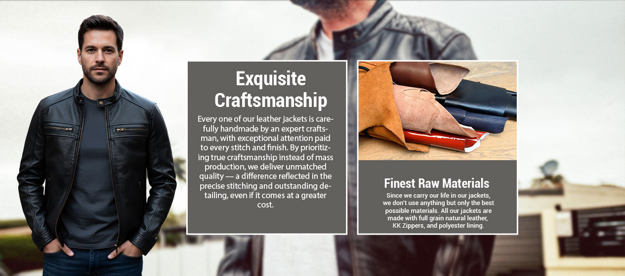 We begin with the bestnatural full-grain and top-grain hidesthat offer durability, strength, and comfort. Unlike imitation or split leather, ours grows richer with age, giving every jacket a character as unique as the person wearing it.