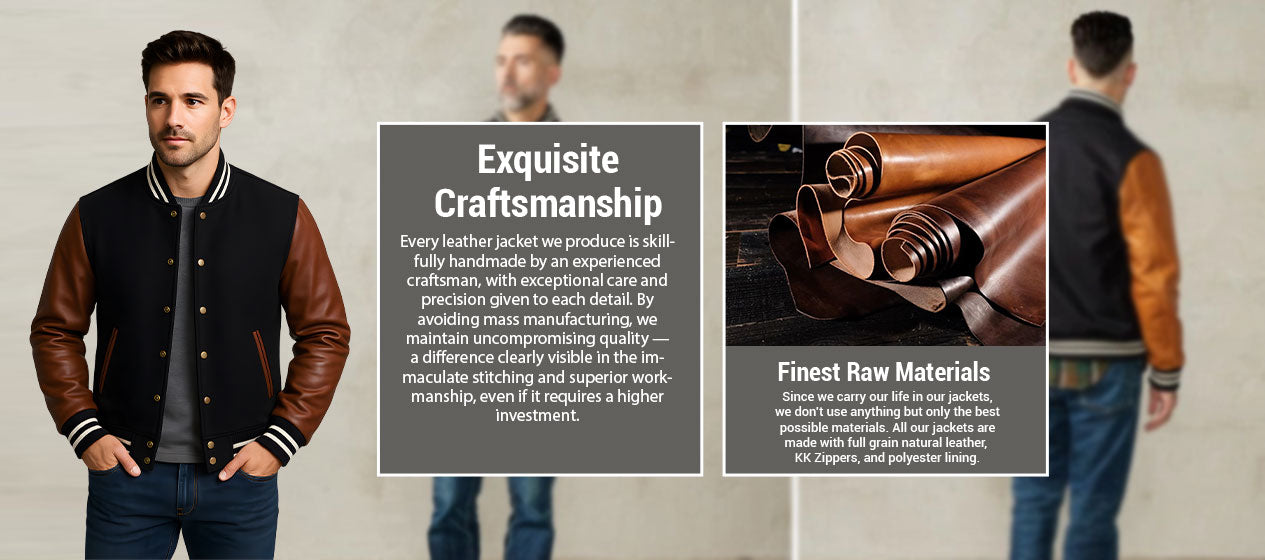 We begin with the best natural full-grain and top-grain hides that offer durability, strength, and comfort. Unlike imitation or split leather, ours grows richer with age, giving every jacket a character as unique as the person wearing it.